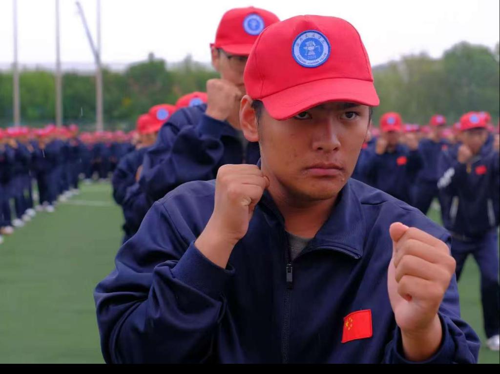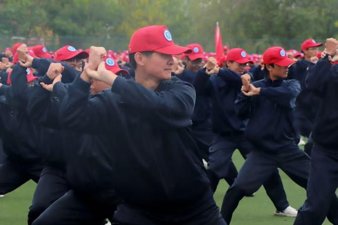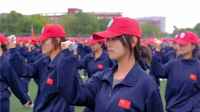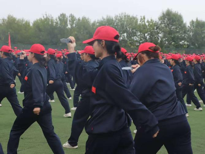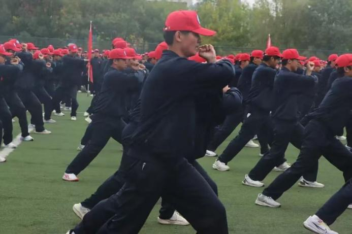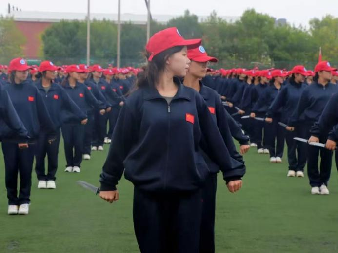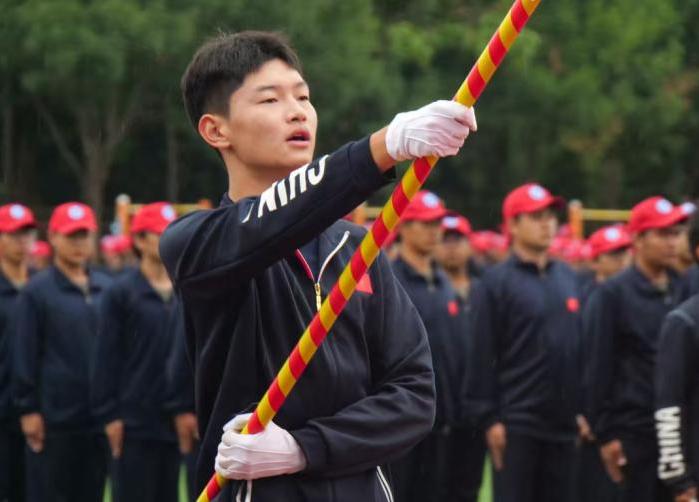 军事科目汇报环节,擒敌拳方阵刚劲有力、匕首操方阵英姿飒爽,动作行云流水,赢得全场热烈掌声。表演结束后,全体新生集体喊出“进德修业、知行合一”的校训口号,声音洪亮,气势如虹,彰显我校学子的信念与担当。