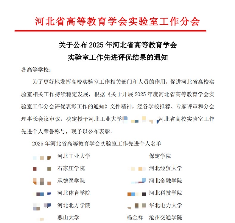 近日,河北省高等教育学会公布了2025年实验室建设与管理先进评选结果,经专家评审和理事长会议审议,我校杨金祥老师荣获“河北省高校实验室工作先进个人”荣誉称号。