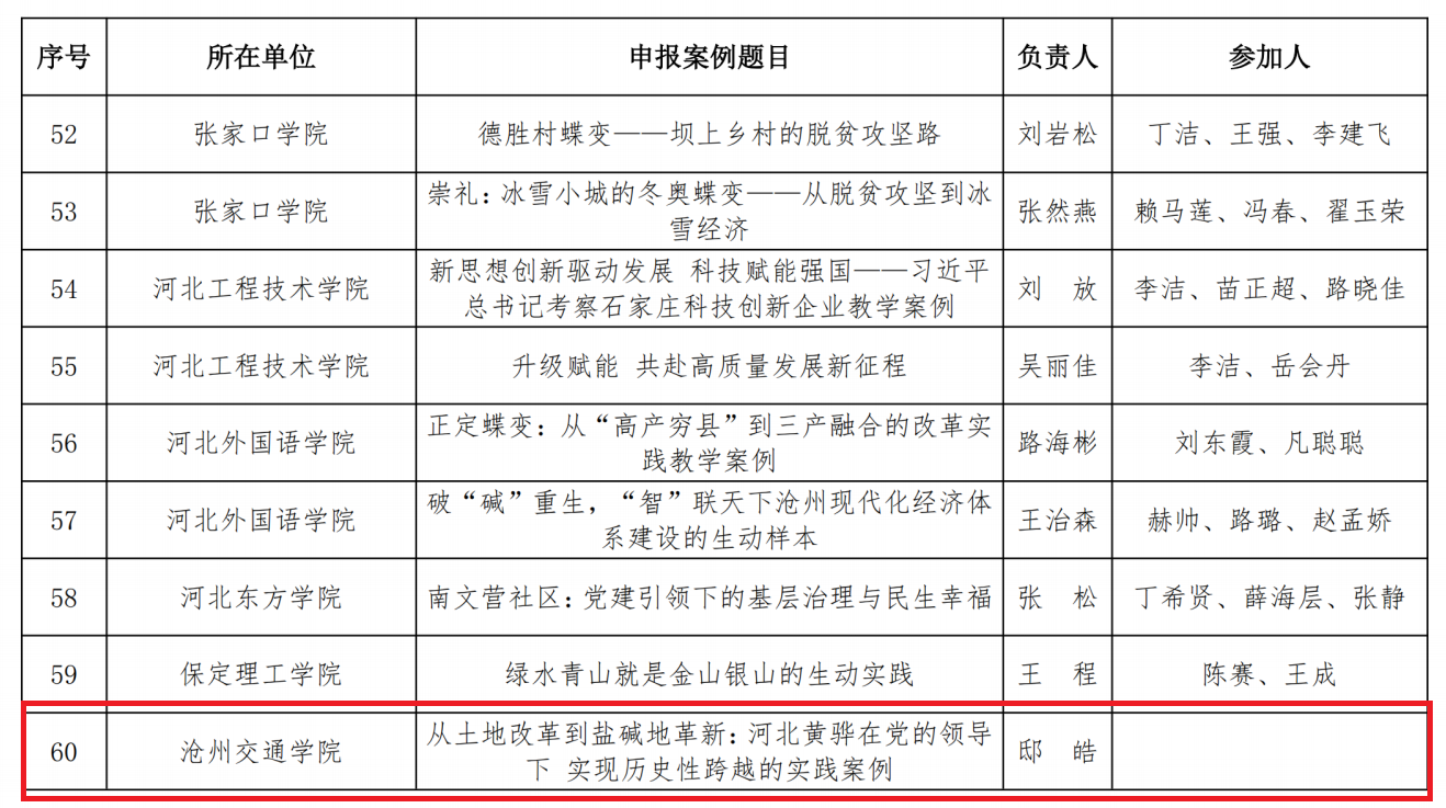 近日,河北省教育厅公布新时代高校思想政治理论课河北伟大实践教学案例评选结果。我校邸皓副教授申报的《从土地改革到盐碱地革新:河北黄骅在党的领导下实现历史性跨越的实践案例》成功入选省级教学案例名单。这标志着我校在思政课教学改革与实践资源挖掘方面取得新突破。