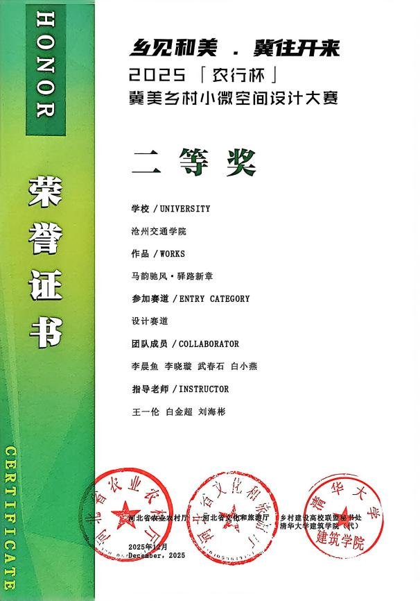 近日,首届2025“农行杯”冀美乡村小微空间设计大赛评选结果正式公布。 我校艺术学院学子在比赛中表现突出,李晨鱼、李晓璇等同学的作品荣获省级二等奖,充分展示了我校在跨学科实践与乡村设计领域的育人成效。