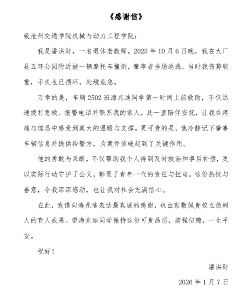 2026年1月8日,我校收到一封真挚的感谢信。信中高度赞扬了我校机械与动力工程学院车辆工程专业2502班海兆迪同学见义勇为、热心救助受伤老人的善举。这封信不仅传递着受助者家属的深切谢意,也映照出我校学子扎根日常、勇于担当的青春风采。