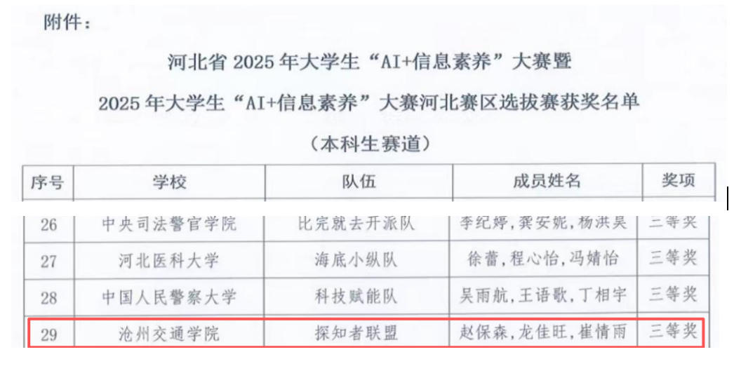 近日,2025年大学生“AI+信息素养”大赛决赛结果揭晓,我校图书馆指导的“探知者联盟”代表队首次参赛即表现优异,荣获省级三等奖,充分展现了我校学子扎实的信息素养与较强的创新实践能力。