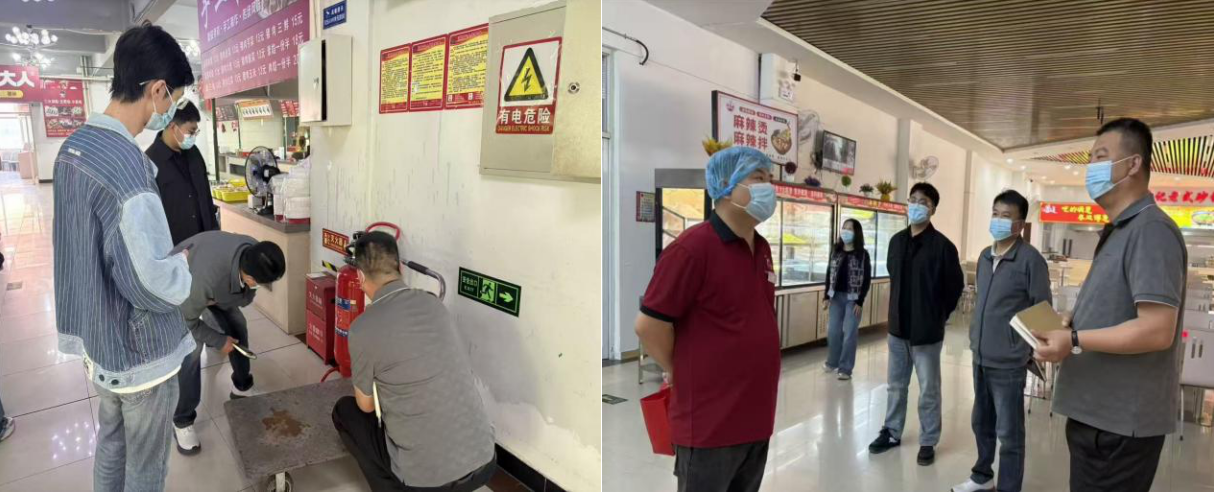 联合检查组先后深入学生食堂、商业区域、学生宿舍等重点场所,通过实地查看、台账核查、现场问询等方式,开展全面细致的安全排查。