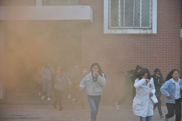 下午16时,我校党委副书记魏炜宣布演习正式开始。消防演练从实战出发,整个过程包括发现并确认火情、报警、开启应急门、启动学校火灾应急预案、现场灭火、组织学生从疏散通道有序撤离等环节。警报声响起时刻,同学们用湿毛巾捂住口鼻、俯身前行,井然有序地按照预定的逃生疏散路线撤离事故发生地,直至2618人安全抵达直达地点。