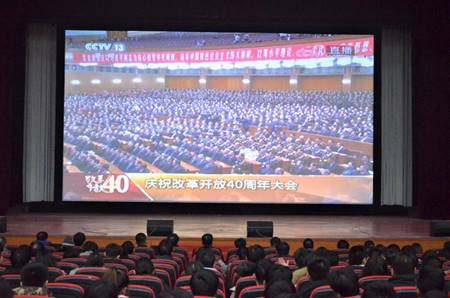 庆祝改革开放40周年大会于2018年12月18日上午10时在人民大会堂举行。中共中央总书记、国家主席、中央军委主席习近平同志发表重要讲话。我校在校校领导、全体无教学任务的教职员工和部分学生代表在天佑会堂主场集中观看了改革开放40周年大会盛况,其他师生也充分利用网络、广播、手机客户端等多种渠道、多种方式收听收看。全体师生第一时间学习领悟大会精神,一同回顾改革开放40周年的光辉历程,总结改革开放40周年成就。