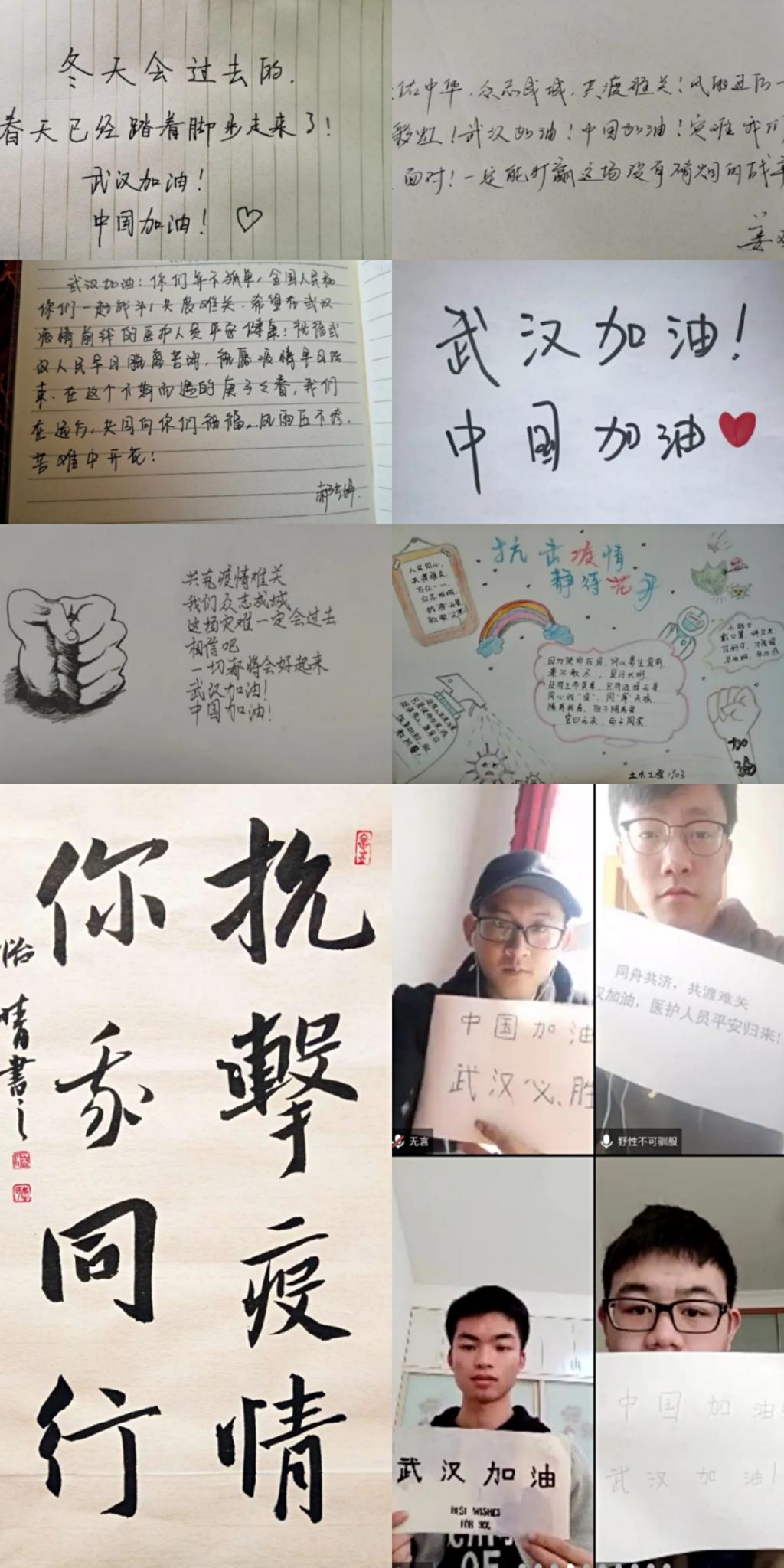 “隔离病毒,不隔离爱”,疫情期间土木建筑工程学院学生心系武汉,用笔书写出自己对武汉的祝福与期望,录制加油视频,致敬每一位奋斗在一线的工作人员,助力武汉克服难关。各位学生的爱定会跨越山河,飞向每一位身处“黑暗”中的人。