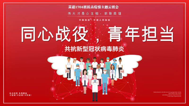 在全国上下一心抗击新冠肺炎疫情的关键时刻,作为新时代大学生,认真落实上级决策部署、全力支持疫情防控工作,是我们义不容辞的责任。我校外国语学院积极响应号召,倡议各班隔空互动,召开以“同心战疫,青年担当”为主题的“云”班会。