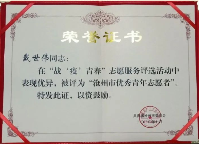 为弘扬和培育“奉献、友爱、互助、进步”的志愿精神,表彰在抗击疫情期间做出突出贡献的优秀志愿者,共青团沧州市委员会在全市范围内开展“战‘疫’青春”志愿服务先进典型评选活动。我校土木建筑工程学院工程造价专业1802班学生戴世伟被授予“沧州市优秀青年志愿者”荣誉称号。