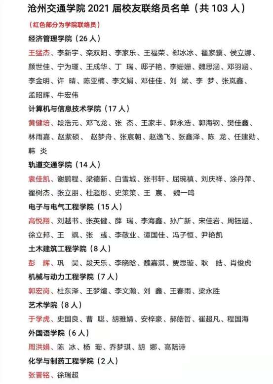 会上,校长助理邵晓康指出,校友联络员是凝聚校友情谊、传承母校精神的核心力量,在母校与校友共同发展的过程中发挥着举足轻重的作用。他希望各位校友联络员牢记责任与使命,情牵母校、心系校友,广泛联络校友,积极服务母校,从而推动校友工作与母校事业的全面发展。招生就业处处长张建新宣读了《关于聘任沧州交通学院2021届校友联络员的决定》。