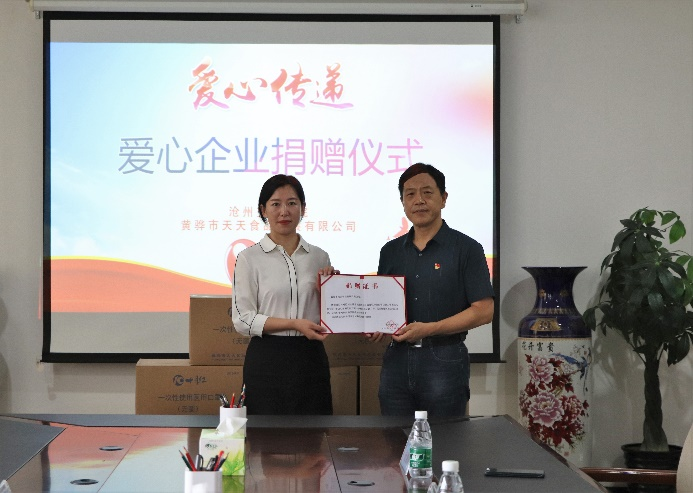 黄骅市天天食品发展有限公司副总经理李飞介绍了公司的基本情况,她表示,虽然公司只是一个民营企业,但是他们将积极承担企业的社会责任,用这些物资为学校返乡学生增加一份安全防护,为打赢疫情防控阻击战做出贡献。