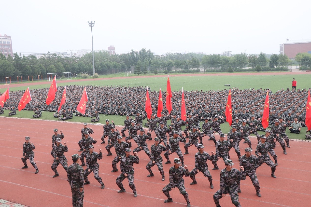 军体拳方阵中,教官们喊着洪亮的口号入场,青春少年、风华正茂。一套干净利落而又不失力量的军体拳,向在场师生展示了他们朝气蓬勃、奋发向上、积极进取的青春活力。