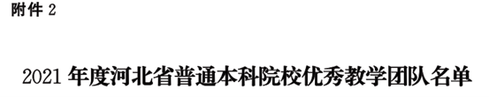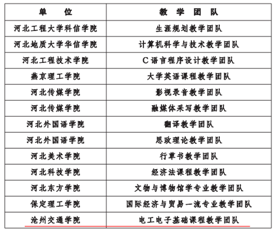 近日,河北省教育厅公布了2021年度河北省普通本科院校教学名师和优秀教学团队名单,我校田春子副教授荣获2021年河北省普通高等学校本科教学名师称号,以电子与电气工程学院郭彬副教授为带头人的“电工电子基础课程教学团队”荣获2021年河北省普通高等学校本科优秀教学团队。