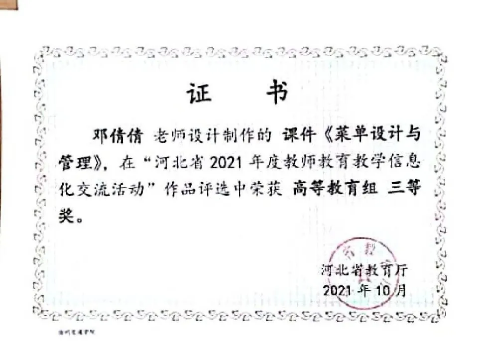 近日,在河北省教育厅主办的“河北省2021年度教师教育教学信息化交流活动”中,我校经济管理学院教师邓倩倩的教学课件《菜单设计与管理》荣获高等教育组三等奖。