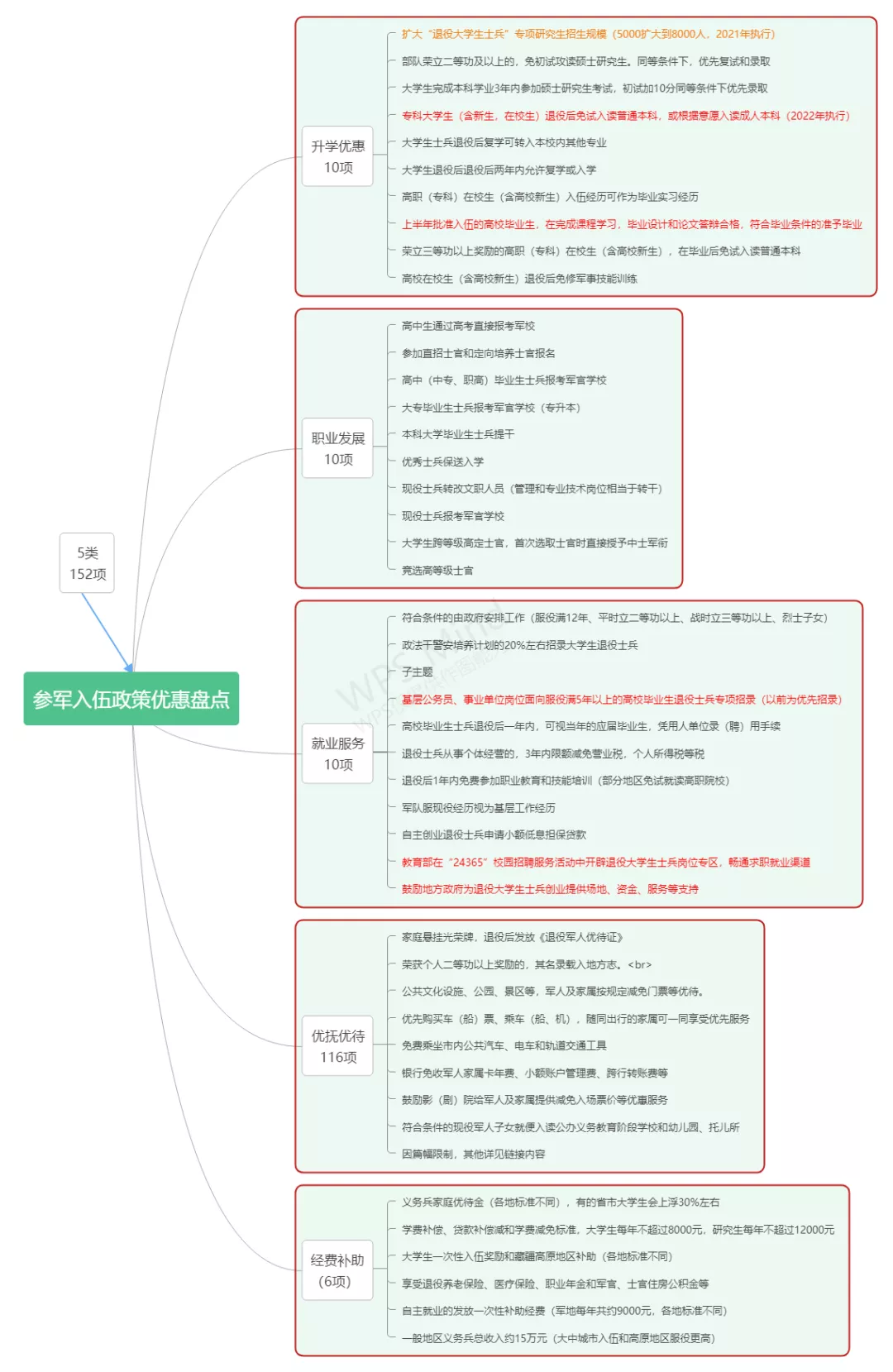 8.优待政策办理,批准入伍新兵,根据征兵办和退役军人事务局的通知要求,及时提供指定开户银行的账号及相关资料,以便办理义务兵优待金,普通高校毕业生、在校生或其家长,持《应征公民入伍通知节》及征兵办复核盖章后的《应征入伍服兵役高等学校学生国家教育资助申请表》,到原就读高校学生资助管理部门办理学费补偿和国家助学货款代偿。由学校所在地应征入伍的高校应届毕业生和在校生,批准入伍后1个月以内,由家长持《应征公民入伍通知书》,到入学前户口所在地县级兵役机关、退役军人事务部门登记,享受军属待遇。