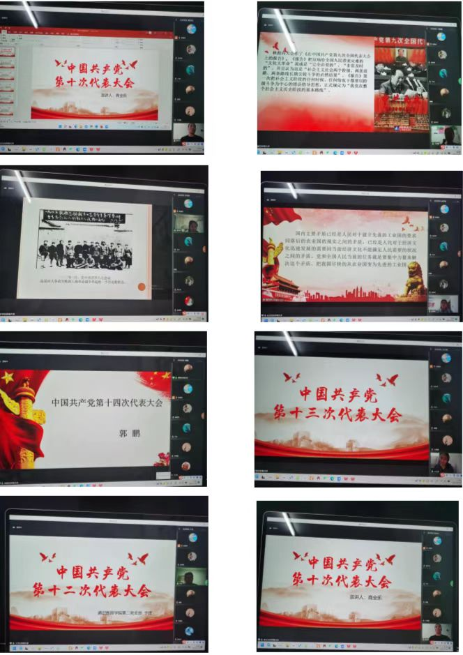 中国共产党自成立以来,已经成功召开了二十次全国代表大会,为了解党代会的历史,学习贯彻党的二十大精神,我校通识教育学院第二党支部开展了“献礼二十大·党员讲党史”活动。活动于11月10日下午4点10分通过腾讯会议开展,16位党员参加会议。本期活动共八个党员教师开讲,向大家讲述了中共六大、中共八大到十四大的历史背景、时间、会议内容、影响等。