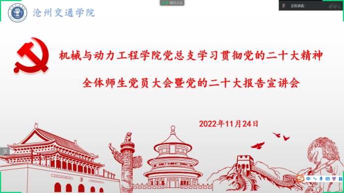 2022年11月24日,机械与动力工程学院党总支通过腾讯会议召开了学习宣传贯彻党的二十大精神暨党的二十大报告宣讲会。