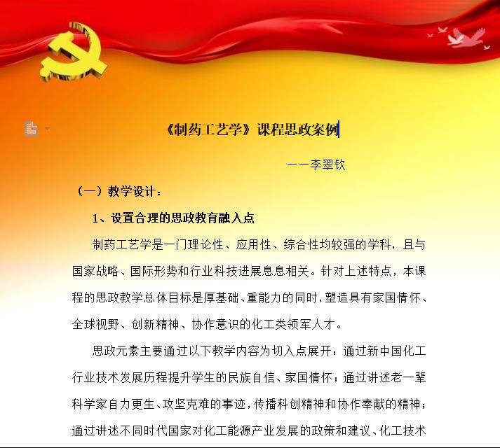 为深入学习宣传贯彻党的二十大精神,我校化学与制药工程学院第一党支部开展党的二十大精神进课堂活动,学院教师根据自己所教授的课程,结合党的二十大精神,设计教学思政案例,并运用到课堂实践中。该活动以丰富多样的形式,让党的二十大精神“热气腾腾”地走进校园,有机融入到课堂中。老师们在知识传授过程中将具体知识背后蕴含的科学观念、认知过程、科学精神以及科学家的家国情怀等内容自然地传递给学生,实现思想和价值的引领,达到立德树人的目的。