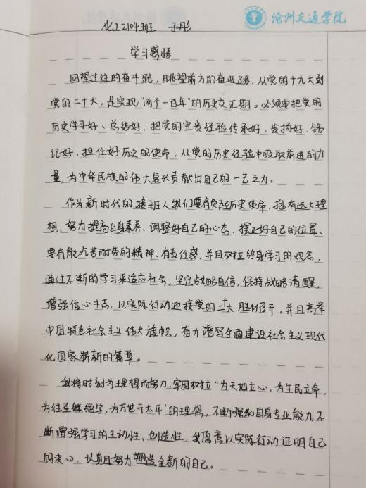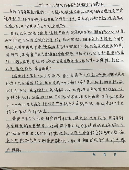 分享结束后,学员们对近期在党的二十大理论学习方面的心得体会展开研讨,王旭同学和杨明嘉同学回望中国共产党奋斗的艰辛历程,从党的伟大革命事业中体会到历史是最生动的、最具有说服力的教科书。作为新时代的接班人,我们要肩负起历史使命,抱有远大理想、努力提高自身素养、有吃苦耐劳的精神、有责任感,并且树立终身学习的观念,通过不断的学习来适应社会,高举中国特色社会主义伟大旗帜,奋力谱写全面建设社会主义现代化国家崭新的篇章。