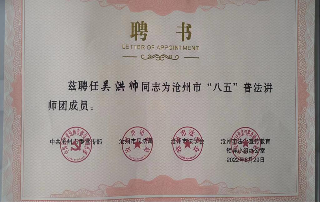 近日,我校经济管理学院教师吴洪帅被聘任为沧州市“八五”普法讲师团成员。