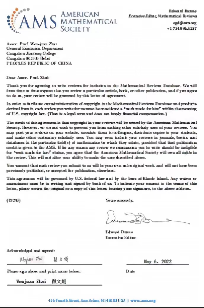 翟文娟老师是我校首个成为美国《数学评论》评论员的教师,主要从事计算数学、统计优化等方面的研究工作,已发表SCI收录及核心学术论文10余篇,论文发表在Applied Mathematical Modeling、Calcolo、Journal of Applied Statistics、Advances in Difference Equations、Journal of Inequalities and Applications、AStA Advances in Statistical Analysis、Journal of Applied Mathematics and Computing等国际重要SCI期刊及《计算数学》,《数学进展》,《高校计算数学学报》等国内核心期刊。主持并完成河北省教育厅高等学校科学研究项目2项,校级重点项目2项。