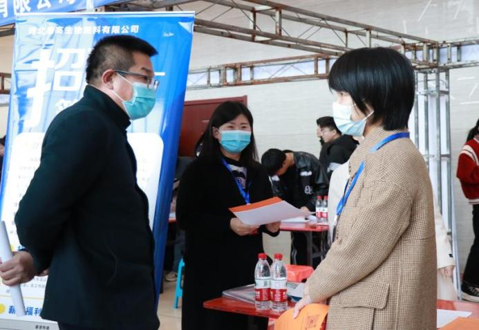 沧州市人才交流服务中心主任崔满城,黄骅市工商联党组书记张建军,渤海新区临港经济开发区人社局局长高希来,沧州渤海新区黄骅市社会事务局就业促进科科长杨为民,港城产业园区社会保障局负责人张媛媛,学校副校长邵晓康、招生就业处处长张建新与各教学单位负责人、毕业生辅导员在现场指导毕业生参加招聘。