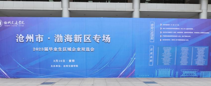 为深入学习贯彻党的二十大精神,落实党中央、国务院“稳就业”“保就业”决策部署,积极响应教育部“春季促就业攻坚行动”,全力促进2023届毕业生高质量充分就业,我校与沧州市人才服务交流中心合作,于2023年3月16日14:00,在天佑会堂举办“沧州交通学院2023届毕业生沧州市•渤海新区企业专场双选会”,本次双选会共邀请沧州企业70家,并有1000余名毕业生参加本次双选会。