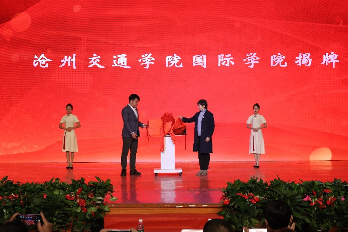渤海新区黄骅市副市长张桂云、我校执行董事长薛君南为沧州交通学院国际学院揭牌。
