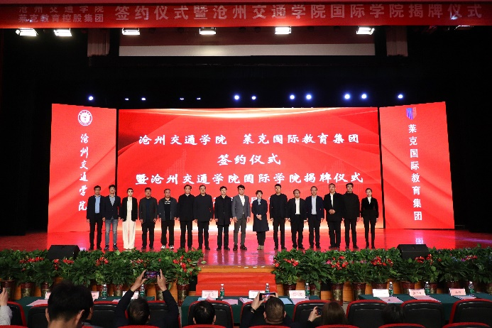 3月23日下午五时,沧州交通学院与莱克国际教育集团签约仪式暨沧州交通学院国际学院揭牌仪式于我校天佑会堂隆重举行。渤海新区黄骅市人民政府副市长张桂云,渤海新区黄骅市教育局局长何寿彪,莱克国际教育集团董事长刘文宪,河北农业大学渤海学院常务副院长马晶军,北京中医药大学东方学院副校长牟兆新,渤海理工职业学院院长张玉军,沧州航空职业学院副院长田树仁,黄骅职教中心党总支书记、常务副校长王强,中捷职业技术学校校长唐金石,黄骅中学校长李拥军,黄骅新世纪中学校长刘志刚,我校执行董事长薛君南,财务总监兼总会计师余裕玲,副校长王忆宁、邵晓康,党委副书记吴立军出席本次仪式。莱克国际教育集团相关领导、我校中层干部及师生代表参会。
