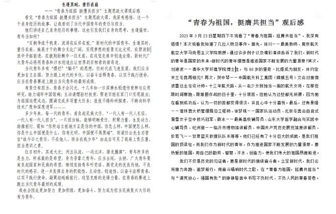 希望沧交学子通过本堂思政课把党的二十大精神内化于心、外化于行,能够坚定理想信念,怀揣伟大梦想,牢记习近平总书记嘱托,立志做有理想、敢担当、能吃苦、肯奋斗的新时代好青年。在全面建设社会主义现代化国家的新征程上一往无前、顽强拼搏,用青春和汗水推进中华民族伟大复兴,让明天的中国更美好!