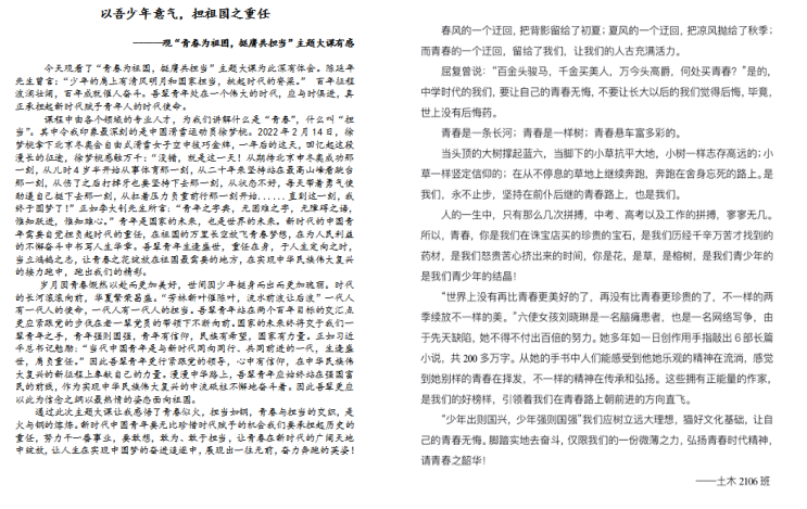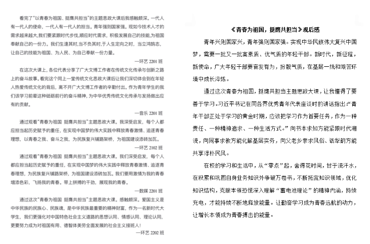 为深入贯彻落实党的二十大重要精神和习近平总书记关于“大思政课”建设的重要指示精神,提高我校广大师生的思想觉悟,引导学生树立正确的人生观、世界观、价值观,我校近期组织广大师生以学院为单位开展了“青春为祖国 荣膺共担当”的学习主题思政大课活动。