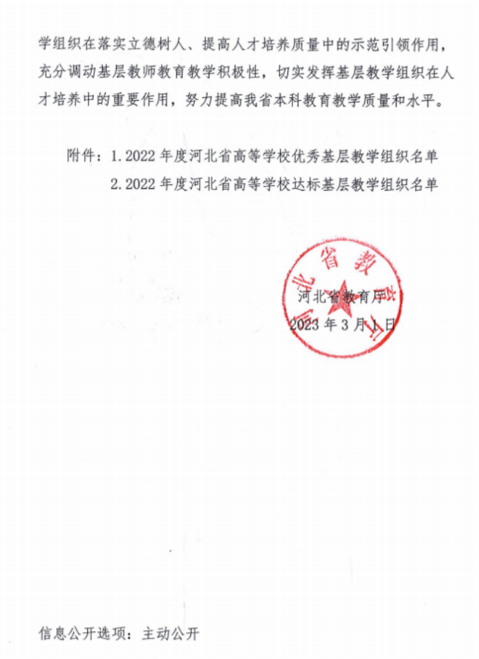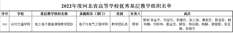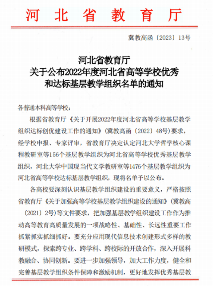 近日,河北省教育厅公布了2022年度河北省高等学校优秀和达标基层教学组织的名单,我校电工电子基础课程教学团队被认定为优秀基层教学组织,工商管理专业教研室等17个基层教学组被认定为达标基层教学组织。
