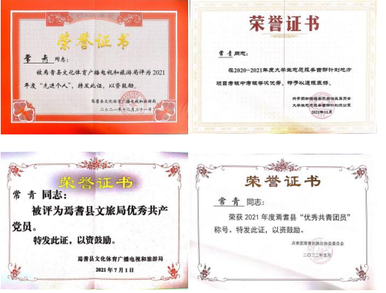 面对困难,常青从不气馁,不懂就问有经验的同事;方案一次不行就接着改两次三次;做得不好就接受批评,吸取教训总结经验。对于自己负责的工作,她会全力以赴去完成,在此期间荣获2021年新疆维吾尔自治区优秀志愿者、焉耆县优秀共青团员、焉耆县文旅局优秀共产党员及先进个人称号。她用努力彻底改变了当地人所持“内地来的大学生不能吃苦,习惯不了新疆的生活”的看法。