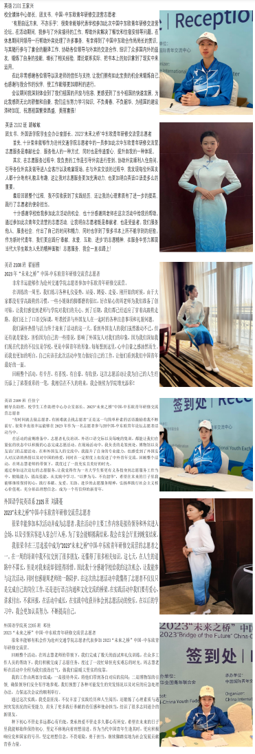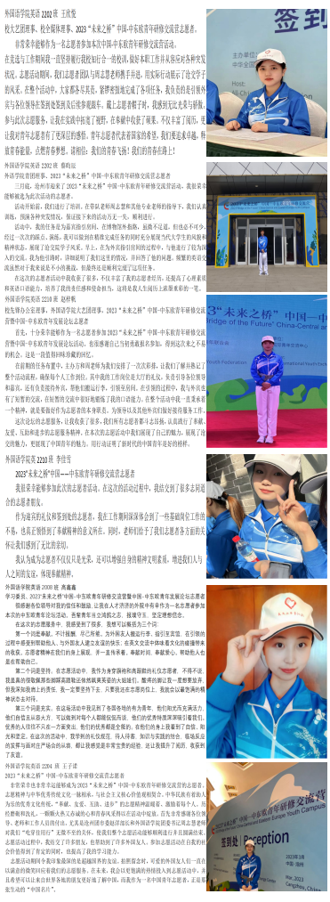 我校外国语学院志愿者纷纷表示很荣幸能够为本次成功举办2023年“未来之桥”中国-中东欧青年研修交流营贡献出自己的一份绵薄之力,参加志愿活动在自我的社会价值得到了肯定的同时,也提高了个人学习能力,对志愿服务有了更深入的体悟的同时也更坚定了为祖国未来发展贡献出自己的青春力量的决心。