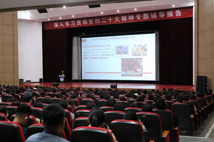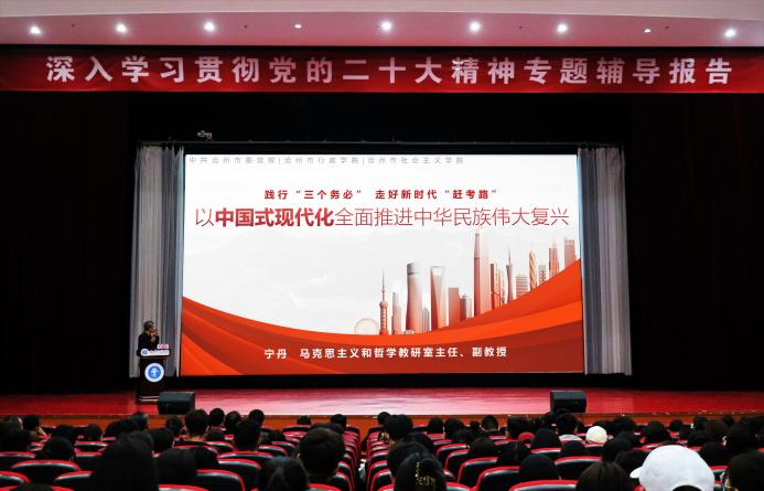 为深入学习贯彻党的二十大精神,在全校持续掀起学习宣传贯彻党的二十大精神热潮,我校于4月26日下午2点在天佑会堂开展深入学习贯彻党的二十大精神专题辅导报告。本次报告会特别邀请了中共沧州市委党校、马克思主义和哲学教研室主任、沧州市思想政治教育特聘教授宁丹作专题讲座。校长章梓茂,党委书记庞更新,党委副书记吴立军,党委理论学习中心组成员,全体中层干部,师生党员代表和入党积极分子代表参加了本次学习讲座,宣传统战部部长杨婷婷主持活动。