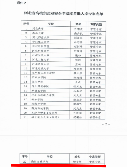 近日,河北省教育厅在《2023年度高校实验室安全检查工作的通知》(冀教高涵〔2023〕30号)文件附件2中公布了“河北省高校实验室安全专家库首批入库专家名单”,我校实验实训管理中心杨金祥入选河北省高校实验室安全管理专家库专家,并参与河北省高校实验室安全检查工作。