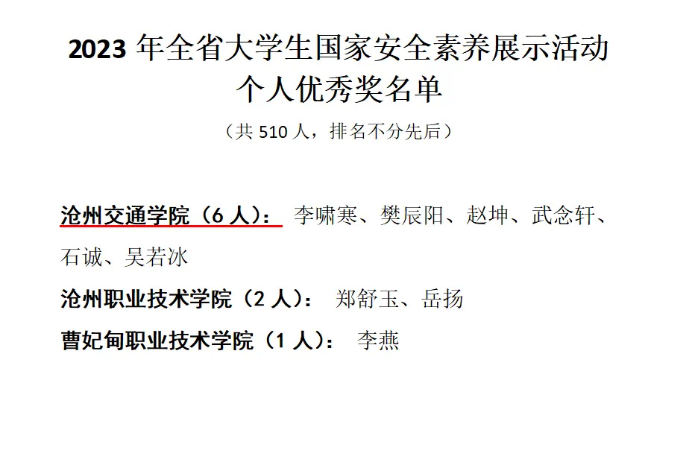 为进一步提高大学生国家安全意识,引导学生深入学习国家安全观,树立保护国家安全的意识,加强大学生自觉维护国家安全的责任感和使命感,省教育厅于3月20日至4月15日举办了2023年河北省高校大学生国家安全素养展示活动。活动中,我校李啸寒、樊辰阳、赵坤、武念轩、石诚、吴若冰六名学生荣获个人优秀奖。