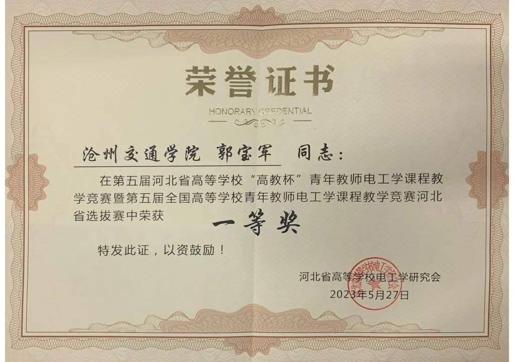 近日,郭宝军老师在第五届河北省高等学校“高教杯”青年教师电工学课程教学竞赛中荣获一等奖。第五届河北省高等学校“高教杯”青年教师电工学课程教学竞赛暨第五届全国高等学校青年教师电工学课程教学竞赛河北省选拔赛于2023年5月27日进行了决赛。此次比赛由河北省高等学校电工学研究会主办,EOCU联盟河北省地区工作委员会和高等教育出版社承办,河北科技大学信息科学与工程学院协办。面对自己在教学竞赛中摘得的硕果,郭老师笑着表示,他参加比赛一开始就不是为了名次,此次比赛准备时间紧张,他一边教书一边备赛,根本料不到最后竟然能取得这样一个优异的成绩。“这次比赛涉及电路、模电、数电、电工与电气四个课程,我自己就是教这些课的,就想着这也是个机会,因为这是一个客观检验我们老师教学水平的渠道,而且届时还会有其他优秀老师分享经验、讲授课程,这对我来说也是一个学习的机会。我觉得老师最重要的职能就是教书育人,这不能懈怠,要时刻抓住机会精进自己的教书育人能力。”