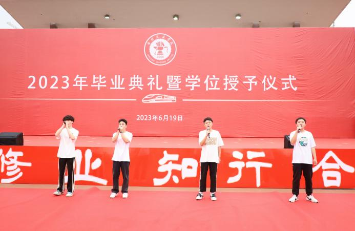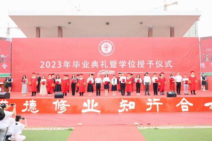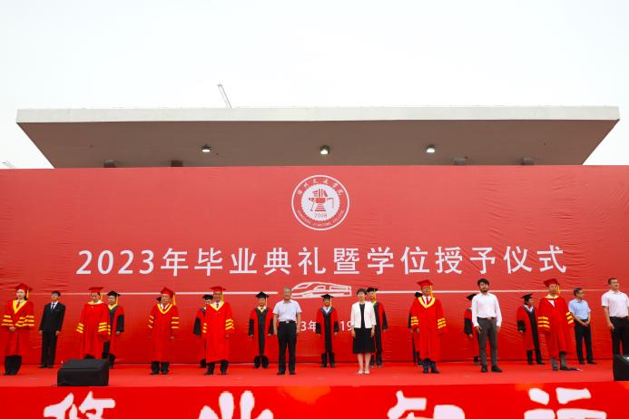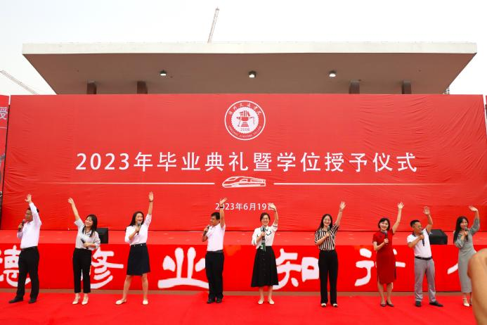 芳华待灼,砥砺深耕。青衿之志,履践致远。6月19日,我校2023年毕业典礼暨学位授予仪式于田径场举行。4585名本科生顺利完成学业,他们即将从“学院西路2009号”再出发,奔赴下一程山海。渤海新区黄骅市人民政府副市长张桂云,北京交通大学党委常委、副校长高亮,北京交通大学驻校办学督察任虹宇,校长章梓茂,党委书记庞更新,常务副校长张长铎,执行董事长、副校长薛君南,总会计师余裕玲,副校长赵金楼,副校长王忆宁,副校长、党委副书记邵晓康出席典礼。各二级学院和职能部处负责人、教师代表参会,党委副书记吴立军主持典礼。