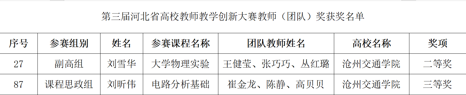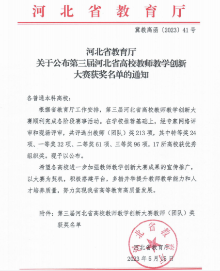 近日,河北省教育厅发布了《关于公布第三届河北省高校教师教学创新大赛获奖名单的通知》(冀教高函〔2023〕41号),此次比赛中我校教师获得喜人成绩。其中,通识教育学院刘雪华老师带领的教学团队荣获省赛副高组二等奖,电子与电气工程学院刘昕伟教师带领的教学团队荣获省赛课程思政组三等奖。