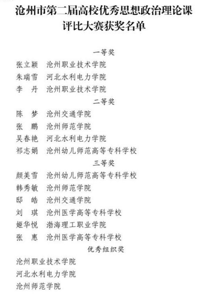 沧州市第二届高校优秀思想政治理论课评比大赛历经各学校初赛、市级复赛和决赛三个阶段现已圆满结束。我校教师陈梦、邸皓分别荣获大赛二等奖、三等奖。