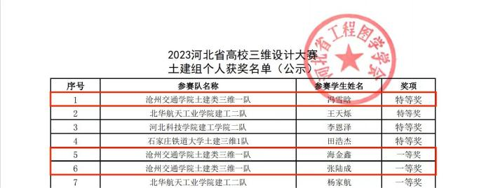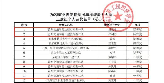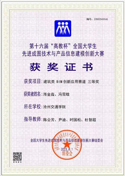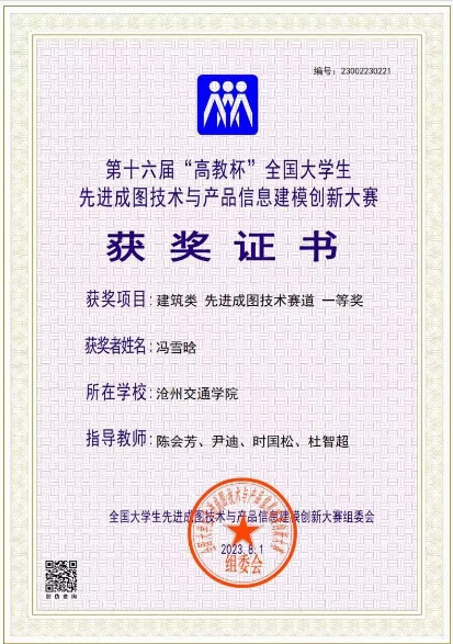 选拔赛后,他们以优异的成绩被河北省教育厅推荐参加第十六届全国大学生先进成图技术与产品信息建模创新大赛。在教师尹迪、杜智超、陈会芳与王雪丽的认真指导下,我校学子进行了长期艰苦的赛前训练。7月29日,在时国松老师带队下,他们在重庆交通大学参加了土建类建筑赛道比赛,获得个人一等奖4项,个人二等奖1项,建筑类团体一等奖,创新赛道三等奖。