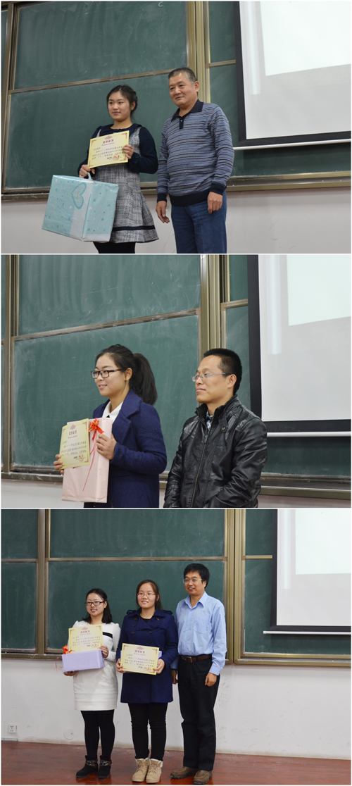 最终,1201班蔡静萍同学荣获一等奖,1201班李恩慧同学荣获二等奖,1205班李珠君、1201班周丽娟两位同学荣获三等奖。土木工程系主任陈凡丁老师、主任助理时国松老师、结构力学学生讲堂指导教师董军老师分别为一、二、三等奖获奖者颁奖。