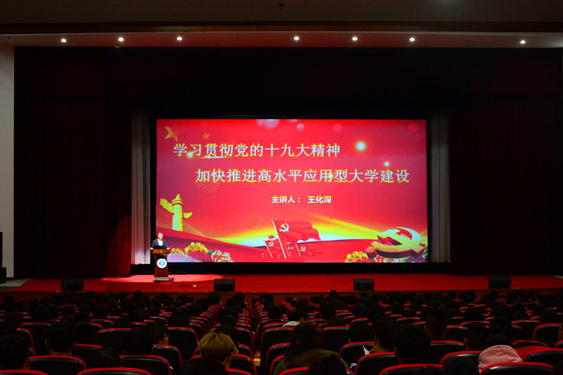 首先,王化深院长全面介绍了党的十九大的会议主题、三大成果和重要意义。在此基础上,王院长从新时代、新使命、新思想、新征程和新要求五个方面展开对党的十九大精神的全面梳理和详细解读。王院长提出以党的十九大精神指导我校工作,全校上下要坚定办学初心,提高教育教学质量,更要加强党的建设。最后,王院长引用了习近平总书记的话:"青年兴则国家兴,青年强则国家强。青年一代有理想、有本领、有担当,国家就有前途,民族就有希望"来鼓舞我校学子。