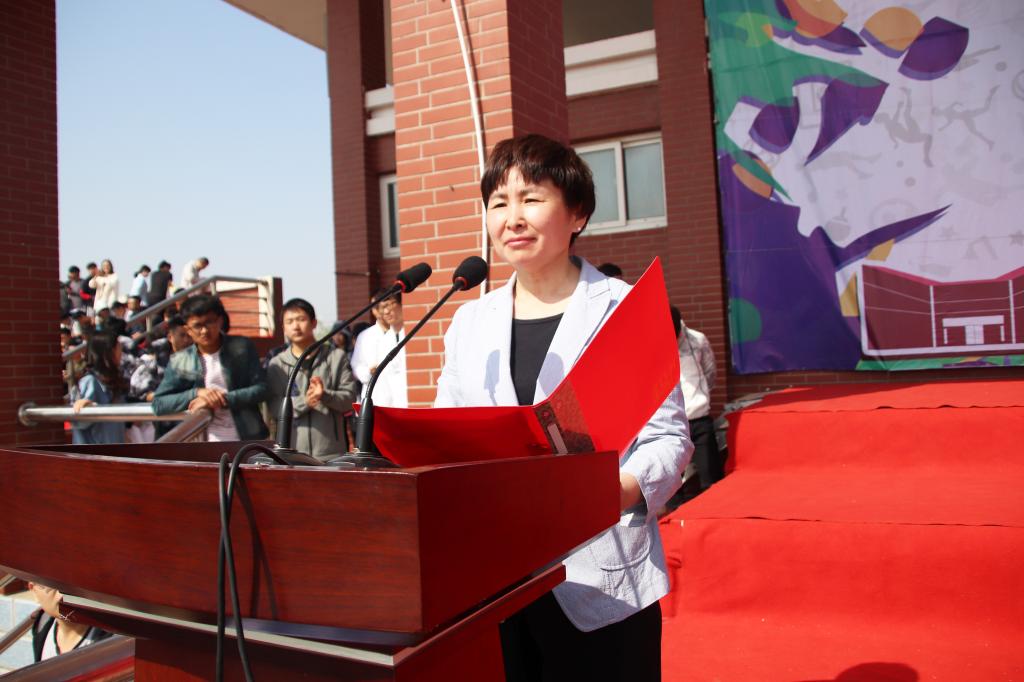 黄骅市政府副市长张桂云致辞,她首先对海滨学院第十届田径运动会的隆重开幕表示热烈祝贺;其次恰逢五四青年节向我校青年学子和教职工致以节日的问候;最后感谢我校积极响应政府号召,重视人才培养的同时,积极参与体育文化活动,为我市体育文化的发展贡献力量。