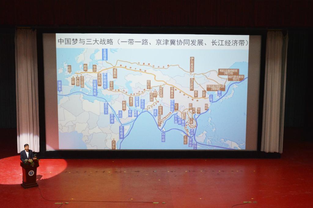 王化深院长首先讲述了中国梦的含义、目标、措施以及战略意义。随后王院长从我国主要矛盾的转变过渡到了对三大战略的讲解。他分析,“一带一路”促进了世界多极化、经济全球化、文化多样化的发展;京津冀协同发展带来的优势,改善了地区发展不平衡的现状,缓解了大城市的拥堵现状,同时在新时代的发展下,实现了交通的大融通;启动长江经济带,实现了我国绿色发展,生态优先的愿望。从而得出三大战略为实现中国梦提供了支撑作用的结论,并以雄安新区的发展为例深化同学们对于京津冀协同发展的认识。