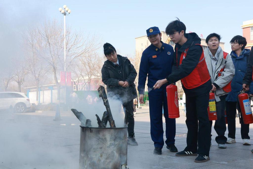 在灭火器实操培训环节,李金秋教官现场演示灭火器“提、拔、握、压”的核心操作要领,详细讲解适用场景及注意事项。随后,师生们分组上前体验,面对熊熊燃烧的油盆,在教官的手把手指导下亲自操作灭火器灭火。同学们认真模仿、大胆尝试,在实践中熟练掌握灭火技能,切实将理论知识转化为实操能力,现场学习氛围浓厚。