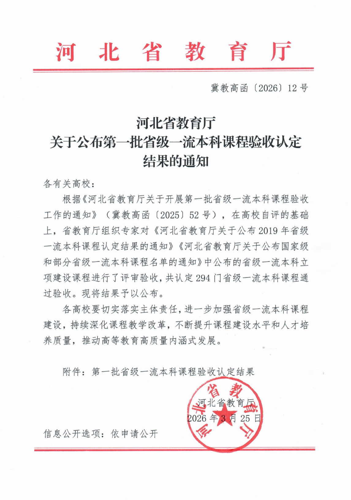 近日,河北省教育厅正式印发《关于公布第一批省级一流本科课程验收认定结果的通知》(冀教高函〔2026〕12 号),我校刘昕伟老师主持的《数字电子技术基础》课程顺利通过验收认定,获评省级一流本科课程。此次获评标志着学校在一流课程建设和应用型人才培养方面再次获得省级权威认可。
